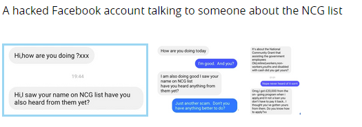 Which? Warn that there’s no such thing as an NCG list (National Community Grant). If you get a message from a Facebook friend starting with “Hello, how are you doing mate?” their Facebook account may have been hacked.